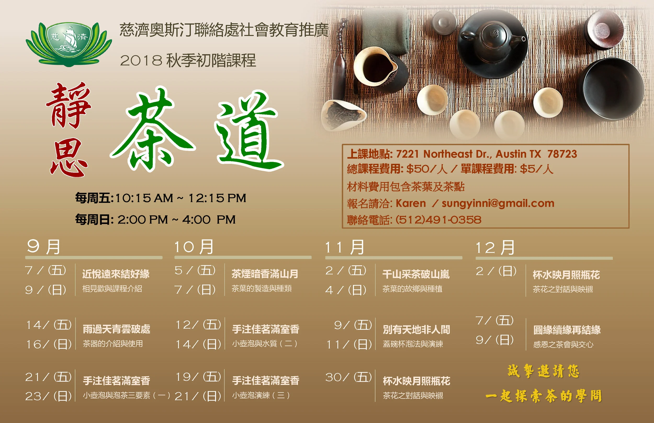 Oct 13 Oct 13 慈濟奧斯汀聯絡處社區活動簡介 TCN 慈濟奧斯汀聯絡處志工深耕社區逾二十多年,社區服務範圍涵蓋了慈善、醫療、教育與人文:慈善活動包括個案關懷、急難救助金協助難民、街友關懷、Rosedale特教學校訪視、老人院訪視、重大災難街頭募款及物資發放等。若有需要救助的案例,提報慈濟之後,經過評估給予適當的協助。醫療活動方面,提供中西醫療健康講座,於每月第一個星期六下午2-4點舉辦,希望為社區民眾健康盡一分「預防重於治療」的心力。 在教育活動方面,慈濟奧斯汀人文班提供華語學習,以及人文精神涵養課程,讓孩子不僅可以學習中文,還能有機會學習中華傳統的倫理與精神。再者,暑假期間則開辦兒童營,提供奧斯汀學童度過一個寓教於樂的豐盈暑假。除此之外,社區讀書會提供會眾另一個心靈成長的契機。「幸福校園」計畫是針對低收入戶學校提供協助,包括提供學生課後輔導、文具用品發放、獎學金發放、制服發放、教職員感恩餐會等。人文活動則致力於社區教育推廣課程,包括「心素食儀」素食推廣、靜思茶道、手語、無量義抄經班、響應環保手工藝品等課程。2018靜思茶道秋季班課程已經開課,但仍接受報名,歡迎一起來品好茶,探索茶的學問。每週將提供兩場不同的時間,但為相同的課程內容. 課程都以中文授課。您可選擇總課程為每人$50 或單一課程為每人$5.每堂課僅限25人。德州大學慈青社是在校園的慈濟青年志工,國高中志工則屬於慈濟少年團(簡稱慈少)。他們在課業之餘,付出心力與時間,為服務社區而盡一份心力,舉凡環保掃公園、老人院訪視、街頭募款等等活動,都能看到他們的菩薩身影。歡迎有興趣的大專及青少年志工加入。各項活動時間與聯絡志工:· 老人院訪視:每月第三、第四個星期六3:00 - 4:00 PM負責志工:Tim Zhang tzhang@ge-eng.com· Rosedale 特教學校訪視:每週三10:00 AM -12:00 PM負責志工:Kevin Luo kwluo@yahoo.com· 社區讀書會:每星期二10:00 AM-12:00 PM負責志工:黃芳文 fangwen.huang@gmail.com· 「幸福校園」計畫各項活動負責志工:黃芳文 fangwen.huang@gmail.com· 無量義抄經班:每月第三、第四個星期六1:00 -2:30 PM負責志工:黃芳文 fangwen.huang@gmail.com· 奧斯汀慈濟人文班:每星期日9:00AM-12:00PM;才藝課12:00-1:00 PM負責志工:蔡宜靜 yijing_tsai@yahoo.com· 靜思茶道:每週五上午10:15am - 12:15pm或每週日下午2:00pm - 4:00pm.負責志工:Karen Sung sungyinni@gmail.com· 德州大學慈青社:各項活動佈達於臉書群組「Tzu Chi Collegiate Association (TCCA) Austin」負責志工:Jack Fan gjf0829@gmail.com· 慈濟少年團(簡稱慈少):各項活動佈達於臉書群組「Tzu Shao-Tzu Chi Youth Group Austin,TX Service Center」負責志工:溫倉彬 tsangbin@yahoo.com· 環保掃公園:每月一次,時間另行通知。十月份活動已定10/13/2018 星期六9:30 AM負責志工:溫倉彬 tsangbin@yahoo.com若是您有興趣參與以上各項活動,歡迎與負責志工聯繫,或是慈濟奧斯汀聯絡處(512)491-0358地址:7221 Northeast Drive, Austin, TX 78723 品一杯好茶,秋意暖心頭慈濟靜思茶道課程秋季班,開課囉!歡迎您呼朋引伴,相約以茶會友,品茗生活中的歡喜與感動,相互學習增長智慧。無論您是新生還是舊生,對茶有無研究,在靜思茶道課程中都能輕鬆學習。上班族學員分享:「上了一星期的班,身心疲倦之餘,期待能有一個時刻是能靜下心來,泡壺茶品茗,讓身心都能夠安定下來,是一大享受!所以,每次都很期待來上靜思茶道課。」八十高齡的學員則表示,雖然自己已經這把年紀了才來學茶道,但是只要有心肯起步,一切都不會太晚。今年才上大一的大男孩鵬宇,雖然是舊生,但是還是認真學習,看他專注定心的泡茶,可以感受到他內心的清淨,不禁讓志工黃芳文感動到淚流。當我們在泡茶的當下,把一份真心誠意與敬意,完全地融入在茶湯中,分享給茶友共享,透過茶湯來交心,是一件多麼美好的人生享受啊!邀約您一起來走入茶的真善美世界!靜思茶道:每週五上午10:15am - 12:15pm 或每週日下午2:00pm - 4:00pm 兩堂課為相同的課程內容. 課程都以中文授課。您可選擇總課程 為每人$50 或單一課程為每人$5. 每堂課僅限25人。 報名或有任何疑問請與Karen Sung sungyinni@gmail.com聯繫