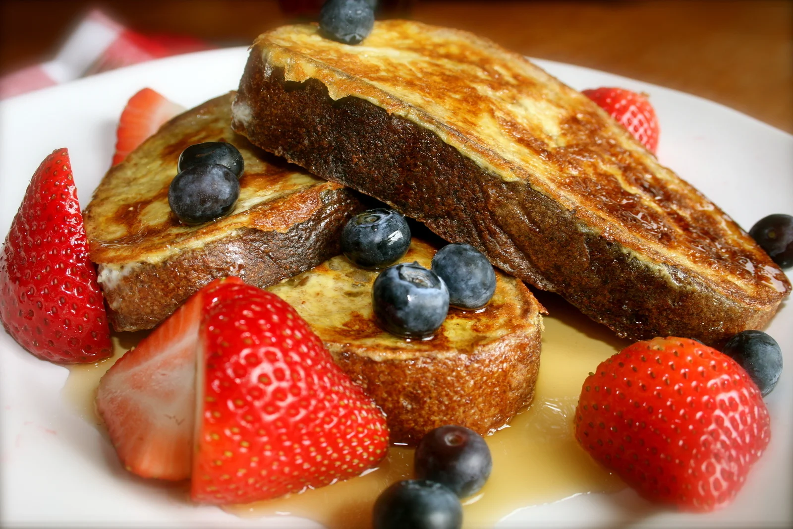 French Toast (法式吐司):切片土司裹上鸡蛋煎至金黄而成,配上糖浆、奶油、水果,松软香甜。
