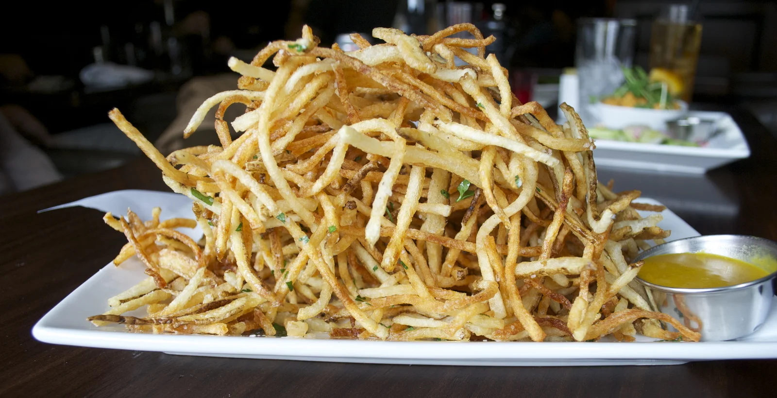 Shoestring Fries:细长酥脆薯条,形状与鞋带有些相似,所以被称为 “鞋带薯条”。比较高档点的餐厅会有此类薯条,在 Steak Frites(牛排与薯条) 中常见,比普通薯条更脆,更入味。