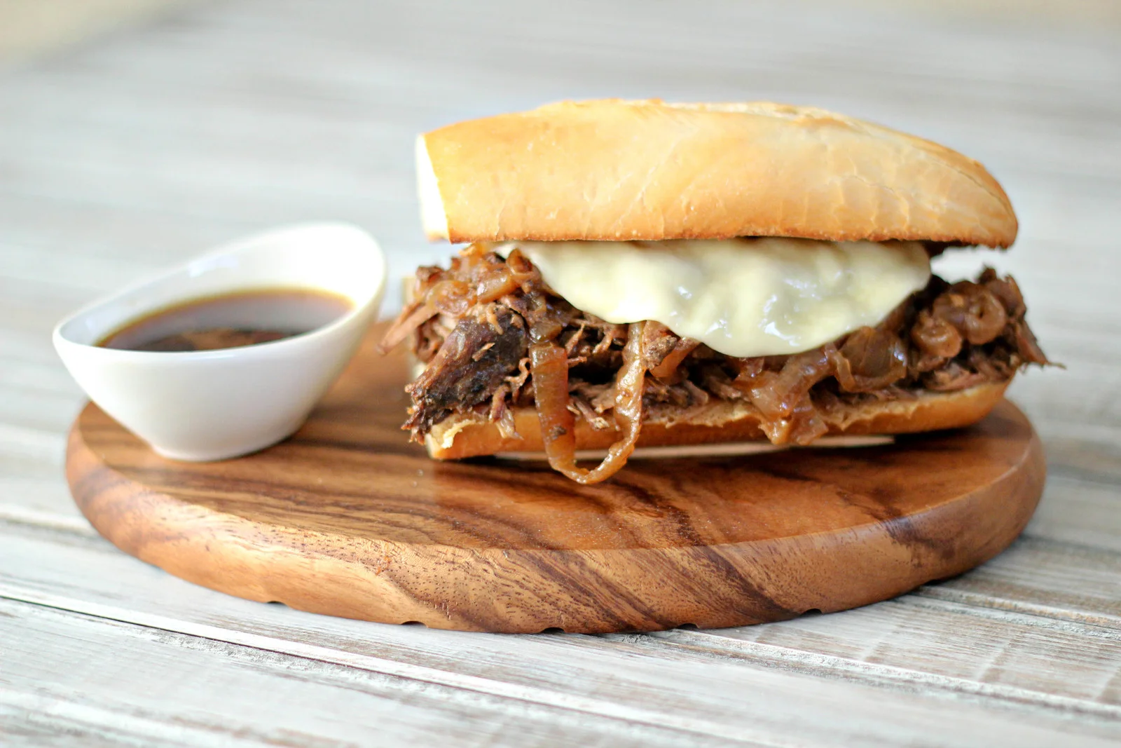 French Dip: 内有一层层薄牛肉片的热三明治,需要蘸着热酱汁一起吃,有些餐厅会直接把酱汁淋在三明治上。
