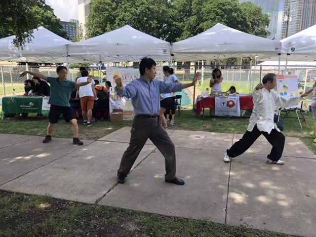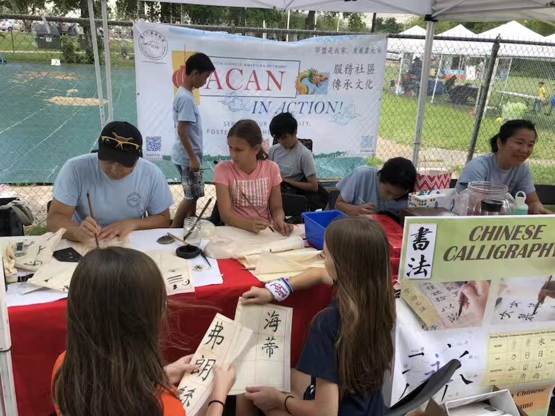 华盟邀请的针灸诊所Acupuncture Plus的汪医生特地赶来坐诊,与前来咨询的人们耐心讲解针灸对病痛的缓解和治疗效用。七十多岁而精神矍铄器宇轩昂的太极拳李作信老师兴致勃勃地为大家表演太极拳基本招式并义务教学。赵勇带着他的十四岁的女儿教孩子们学习毛笔字,做精美的书签。海舟带着两个孩子积极参与各种游戏,帮助游人。刘炜等华盟骨干们积极向人们介绍华盟的宗旨与性质,向其它公益组织宣传华盟。Angela Qian更是不顾炎热在太阳底下坚持组织游戏。