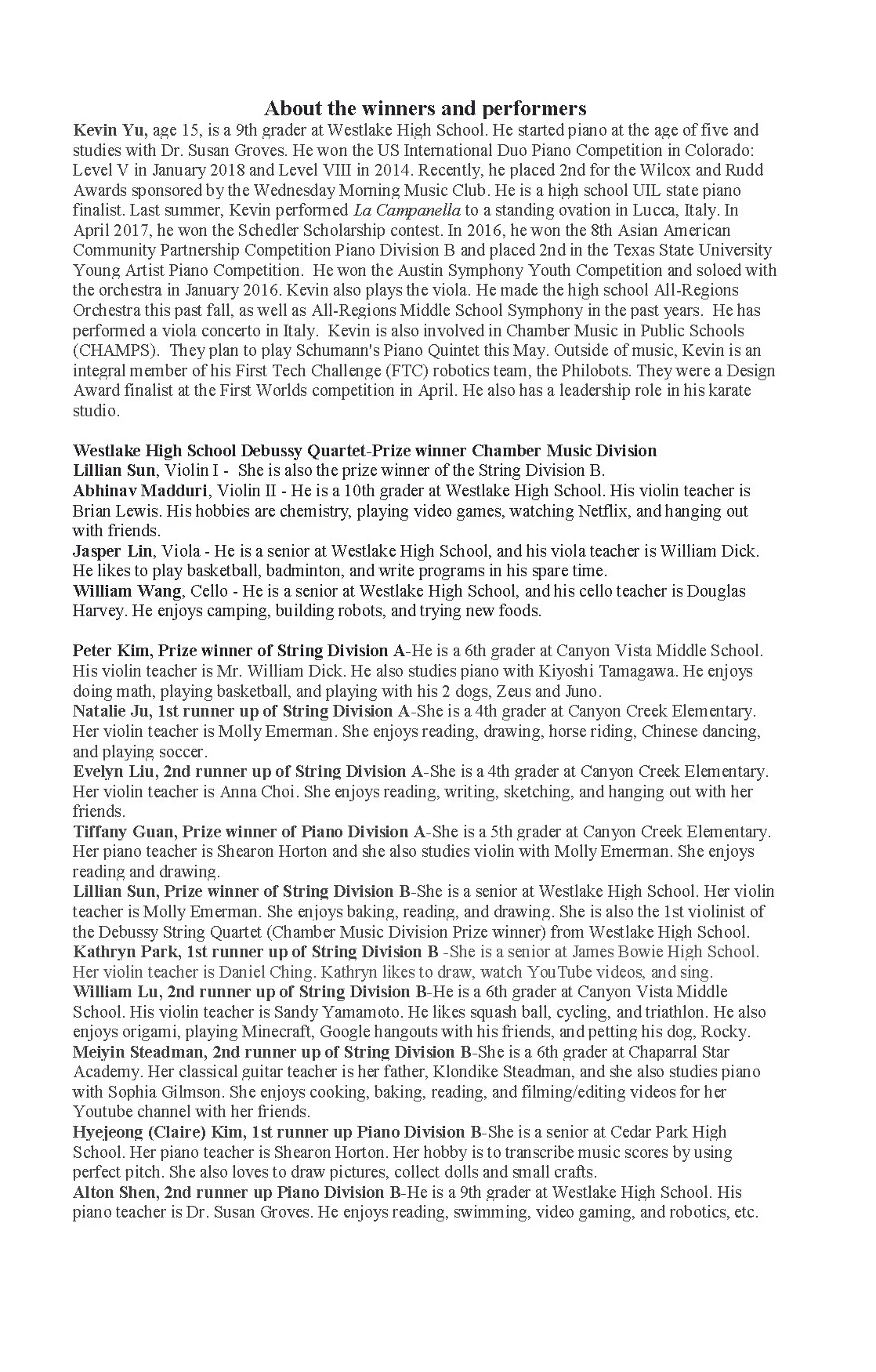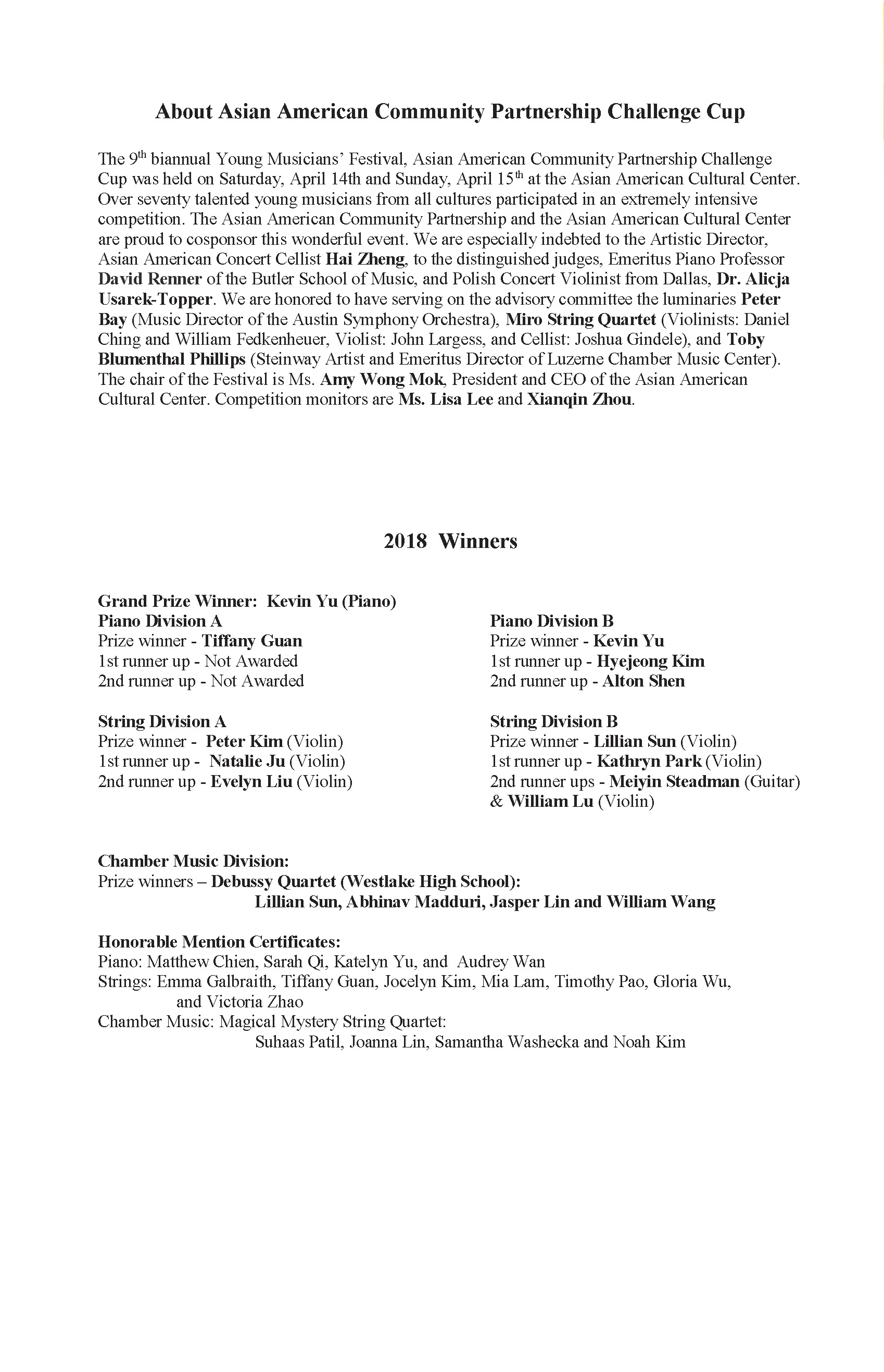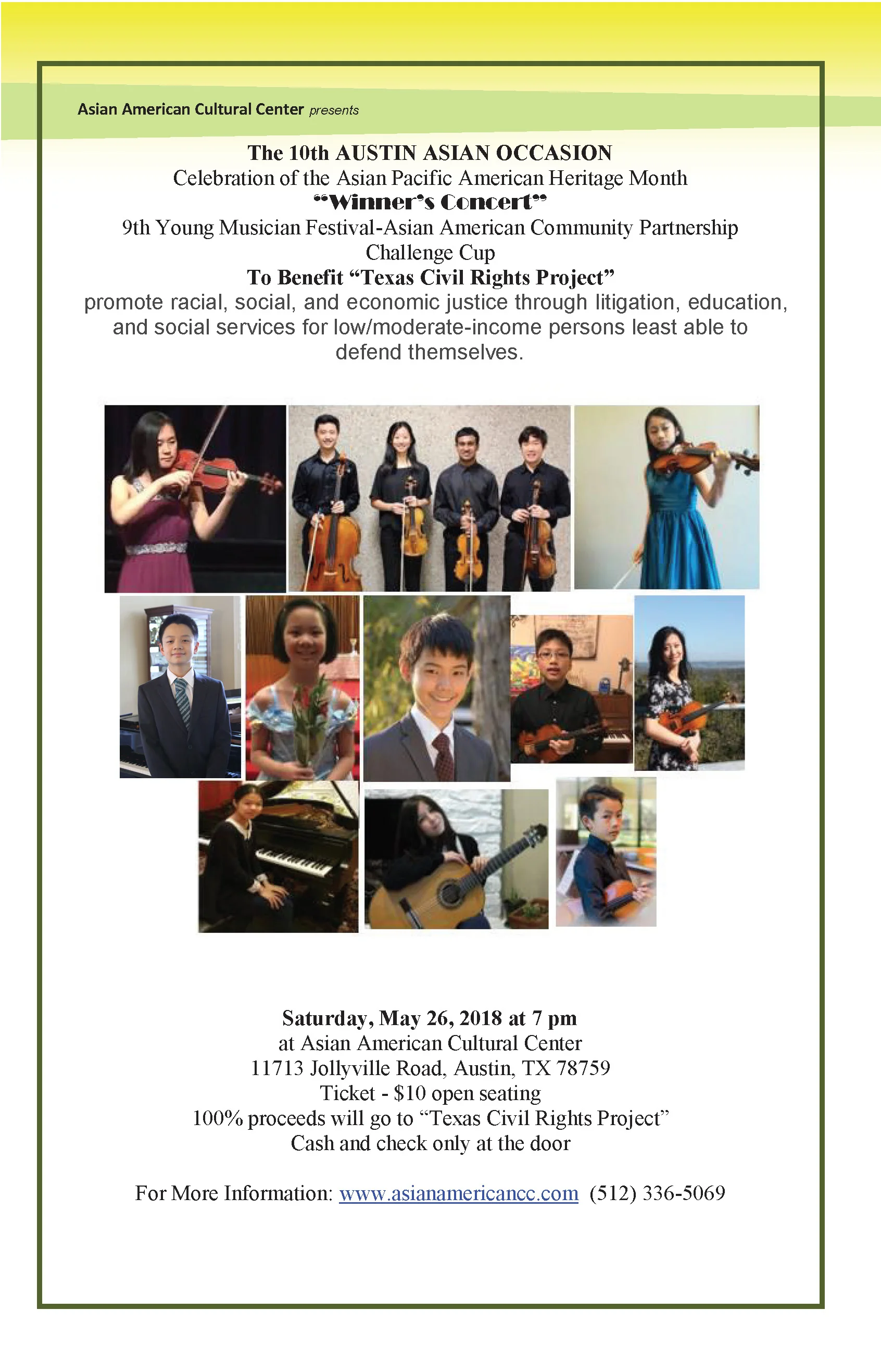 May 29 May 29 “第九届青少年音乐节比赛亚洲美国社区合作挑战杯”获奖者演奏会圆满结束! TCN 热烈祝贺第九届青少年音乐节比赛亚洲美国社区合作挑战杯”获奖者演奏会上周六在Asian American Cultural Center圆满举行!我们的年轻小艺术家们太棒了!为他们喝彩!