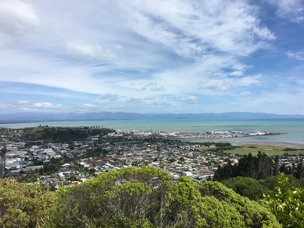 沿着峡湾边的蜿蜒崎岖的山路往西开一个半小时,我们来到海滨城市Nelson。这里有一个比较有名的景点,叫Center of New Zealand(新西兰的中心),需要爬一段陡峭的山坡,在那里可以远眺Nelson城区和港口。