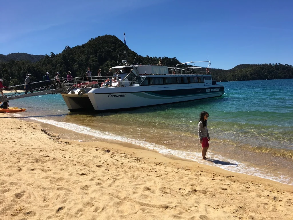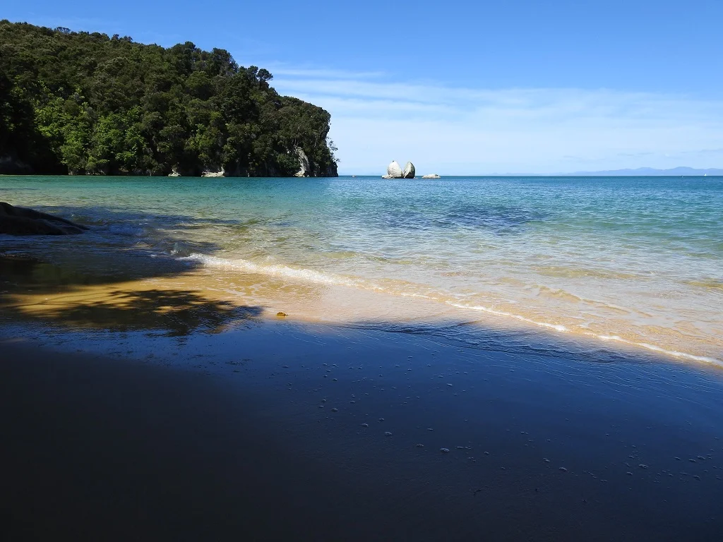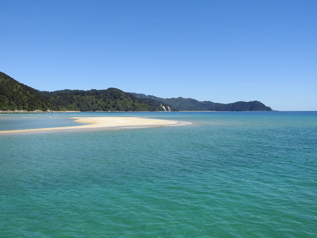 老婆说她早上是被鸟儿吵醒的,我睡得比较死,醒来的时候天已经大亮了。今天主攻Abel Tasman National Park, 公园里有轮渡、皮艇等各项海上活动,还有新西兰最美和人气最旺的海岸步道,全程要3-5天,名列新西兰九大步道之首。我们先坐轮船沿海岸北上开两个半小时,途中有一段水域居然还有海豚护航,然后折返在Medlands Beach下船,沿着盘山伴海的小路一直徒步走到Anchorage。风景的确迷人,有点像美属维京群岛。