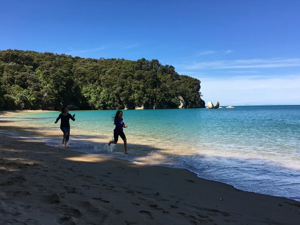 步道沿峡湾绕岛而行,我们穿越于丛林中,经五个海湾,十几座小桥和一座吊桥,耳边是潺潺流水、海浪和婉转鸟鸣,还不断能透过茂密的树丛,看见蔚蓝的大海和崎岖的海岬,又经常能下坡到金色的沙滩上戏水玩沙,中间还吃了顿自带的简易的三明治午餐。