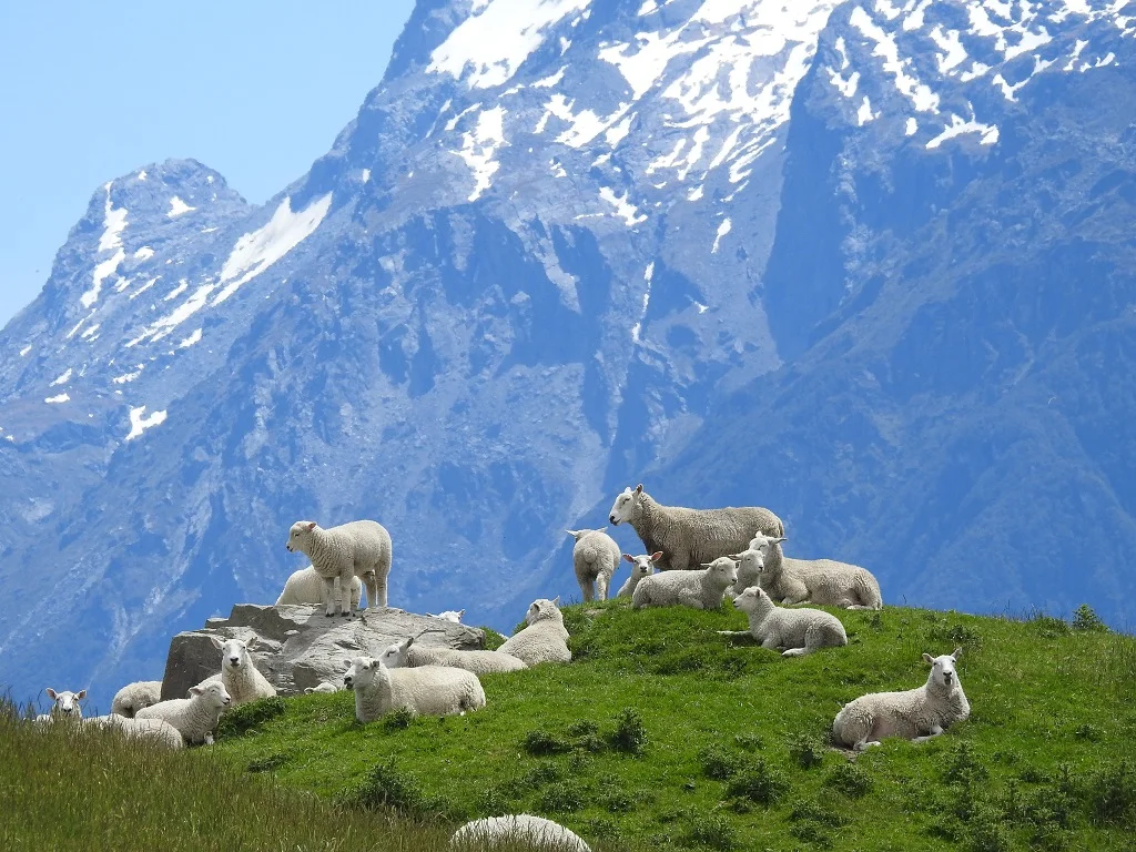新西兰真是牲畜的天堂。一路上到处是绿油油的草场,成群的绵羊,马,还有牛都在懒洋洋地晒太阳。比起我们所住地美国德克萨斯州平原的牲畜80%的时间在吃草,20%的时间休息来说,它们的生活方式正好相反。因为脚下的草太多太肥,它们只须花20%的时间低头觅食,其他80%的时间都是在享受生活。