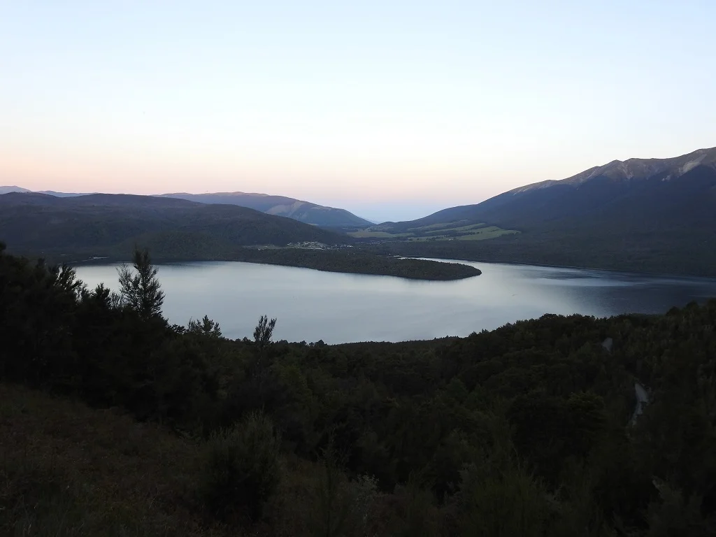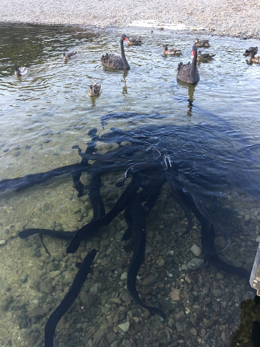 这里和Nelson Lakes国家公园接壤,于是睡前穿着拖鞋去散步,来到公园里Rotoiti湖边,意外惊喜地看到一对体态优雅的黑天鹅,领着一群丑小鸭,找我们要吃的。本来想给点面包,瓜瓜不干,说如果给它们喂食动物的野性就会退化,慢慢地变得过于依赖人类而难以生存。于是苗苗就扔小石头给它们。天鹅和鸭子们都聚集过来,水里还翻腾着几十条面目很邪恶的黑鳗鱼。