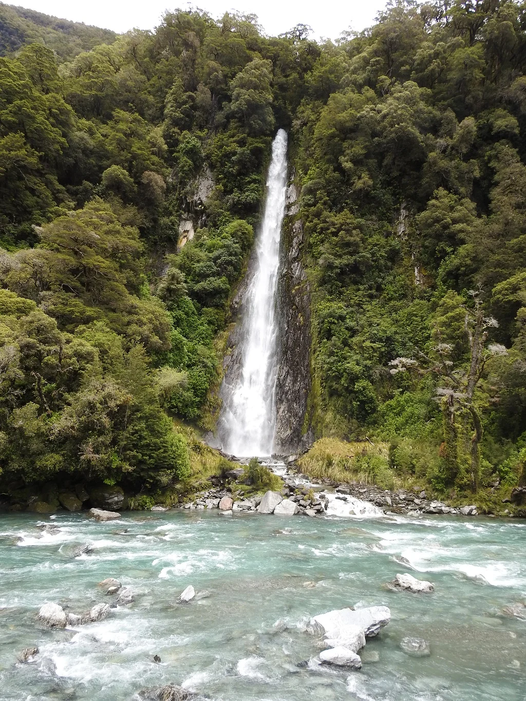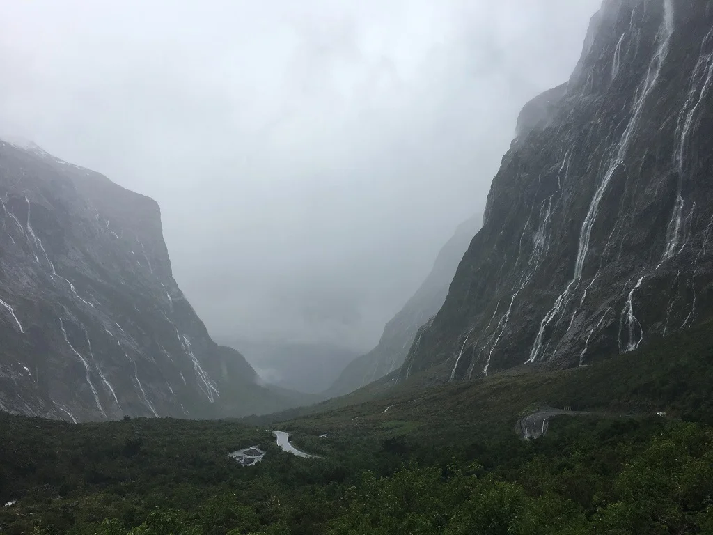去Milford Sound的路上有一个隧道,洞口景色也非常壮观,无数条瀑布从峭壁上飞流直下。