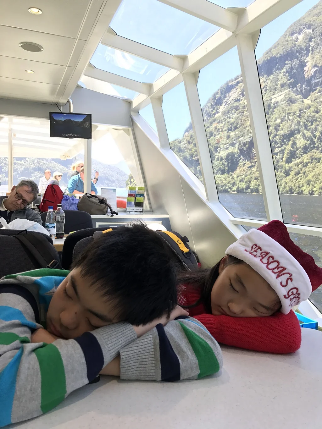 孩子们出来玩,只要屁股挨着凳子就是打手机游戏,屡禁不止。今天好了,低头打着打着突然几个大风浪过后就晕船了,算是给他们一个人生教训吧。