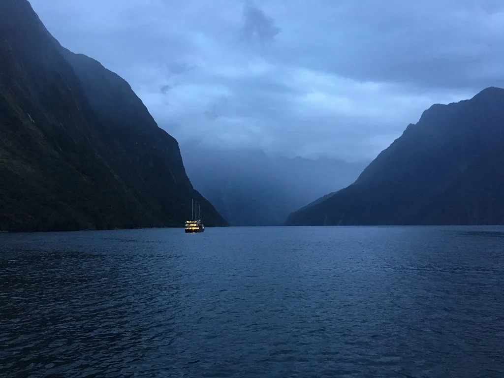 傍晚时分我们上了Milford Sound的游轮,今晚将在船上过夜。米尔福德峡湾是冰峡湾,有着冰川开凿出来的典型地貌—水面狭窄而山石陡峭。这里气候变化莫测,是世界上最潮湿的地区之一,一年有两百多天在下雨。我们比较有运气,天气预报说明天才会有降雨。