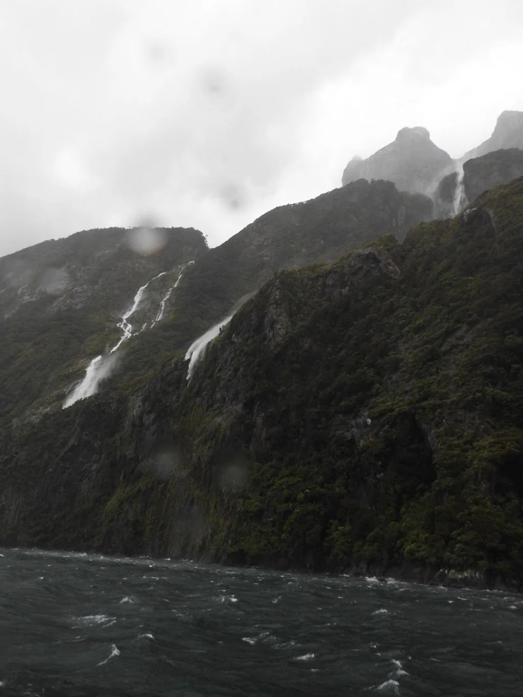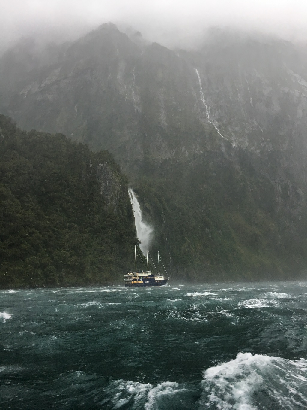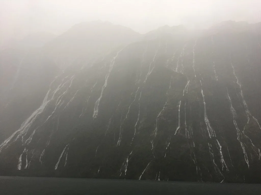早上起来发现下雨了,雨中的Milford Sound多了几分神秘。游轮在峡湾里巡航,大雨倾盆,风浪四起,瀑布从四面群山上如脱缰野马奔腾而下,我们仿佛置身于梦境一般。风最大的时候,瀑布的水没有完全流下来,在半山腰就被大风直接吹散成了云雾。