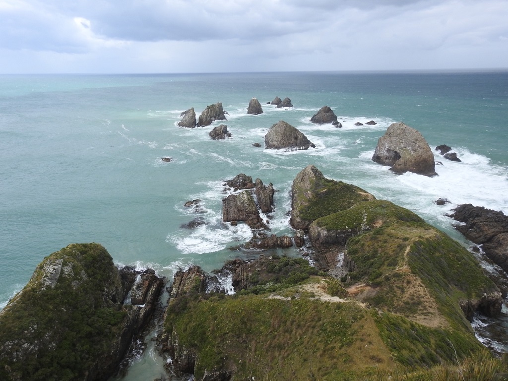 Nuggets Point像是沧桑拉的羊粑粑,一坨一坨地散落在碧绿的海水里。