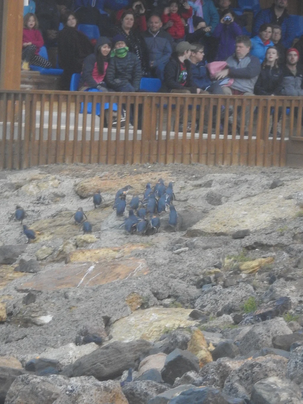 晚上在Oamaru住,这里有一个比较出名的看企鹅的地方,傍晚6-7点是黄眼企鹅回归的时间,9点蓝企鹅回巢。我们吃完晚饭正好可以赶上看世界上体型最小的蓝企鹅。以前企鹅每天回家要横过马路,不安全,并会遭到灯光、游客的骚扰,被称为“都市生活的不幸写照”。两个月前这个城市专门给企鹅修了个25米长的地下通道,并教会了企鹅使用这个通道。可惜天公不作美,下起了冰冷的雨,但是仍然挡不住游人们的热情,观赏的地方已经挤满了很多人。我们刚坐下就听见人群一阵骚动,顺眼望去,只见一队蓝色的企鹅,从海底钻出来,排着整齐的队伍,一摇一摆地往岸上爬,那姿势蛮逗的。
