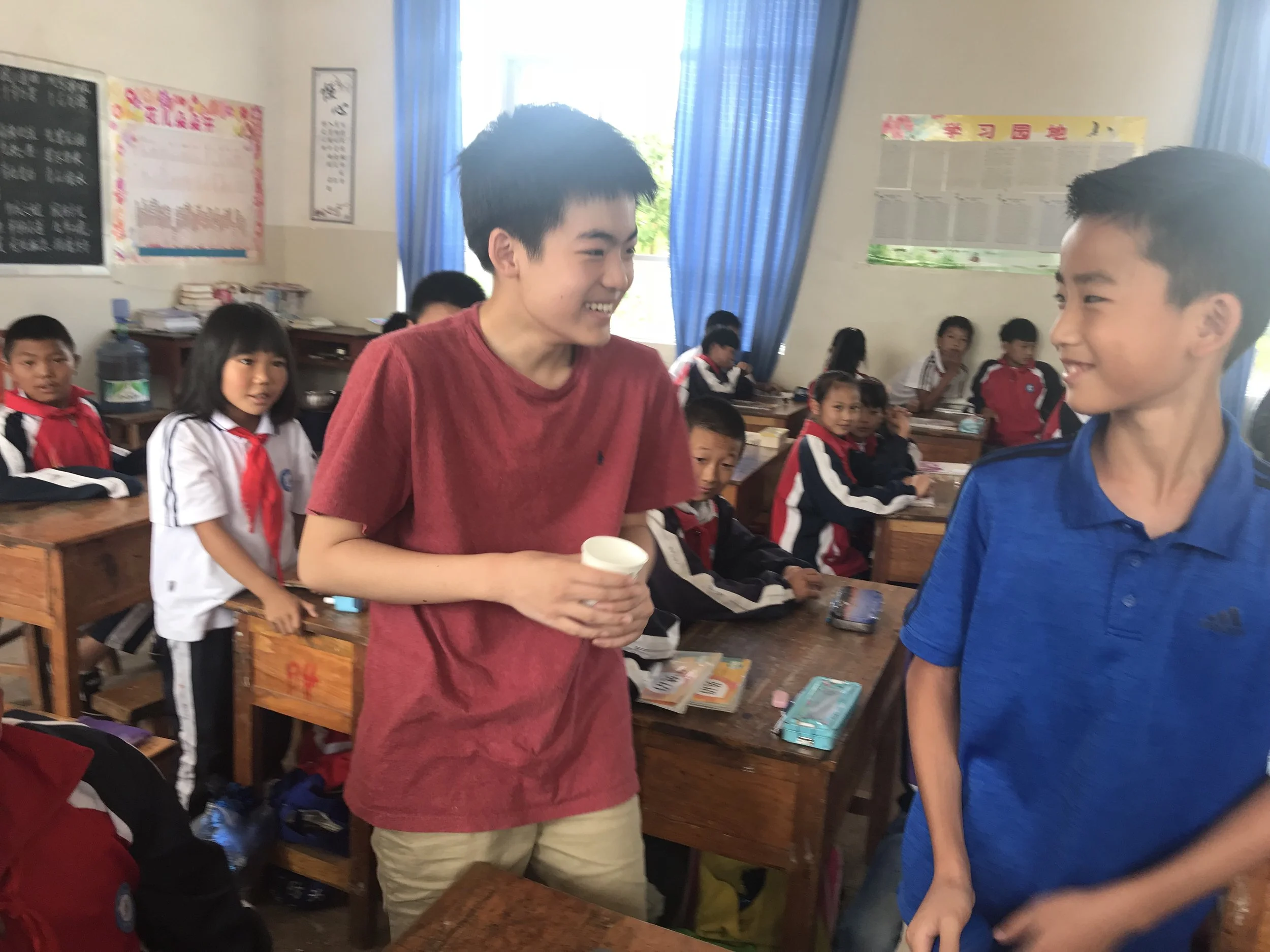 营员们还代老师上音乐课。把英语儿歌游戏介绍给大家。他们惊讶地发现自己在美国玩的一些游戏在这偏远的乡村小学居然一模一样,只有语言和名字不同。孩子们开心地同时玩起了双语版的游戏。音乐与游戏把这些来自不同语言和文化背景的孩子们拉得更近。