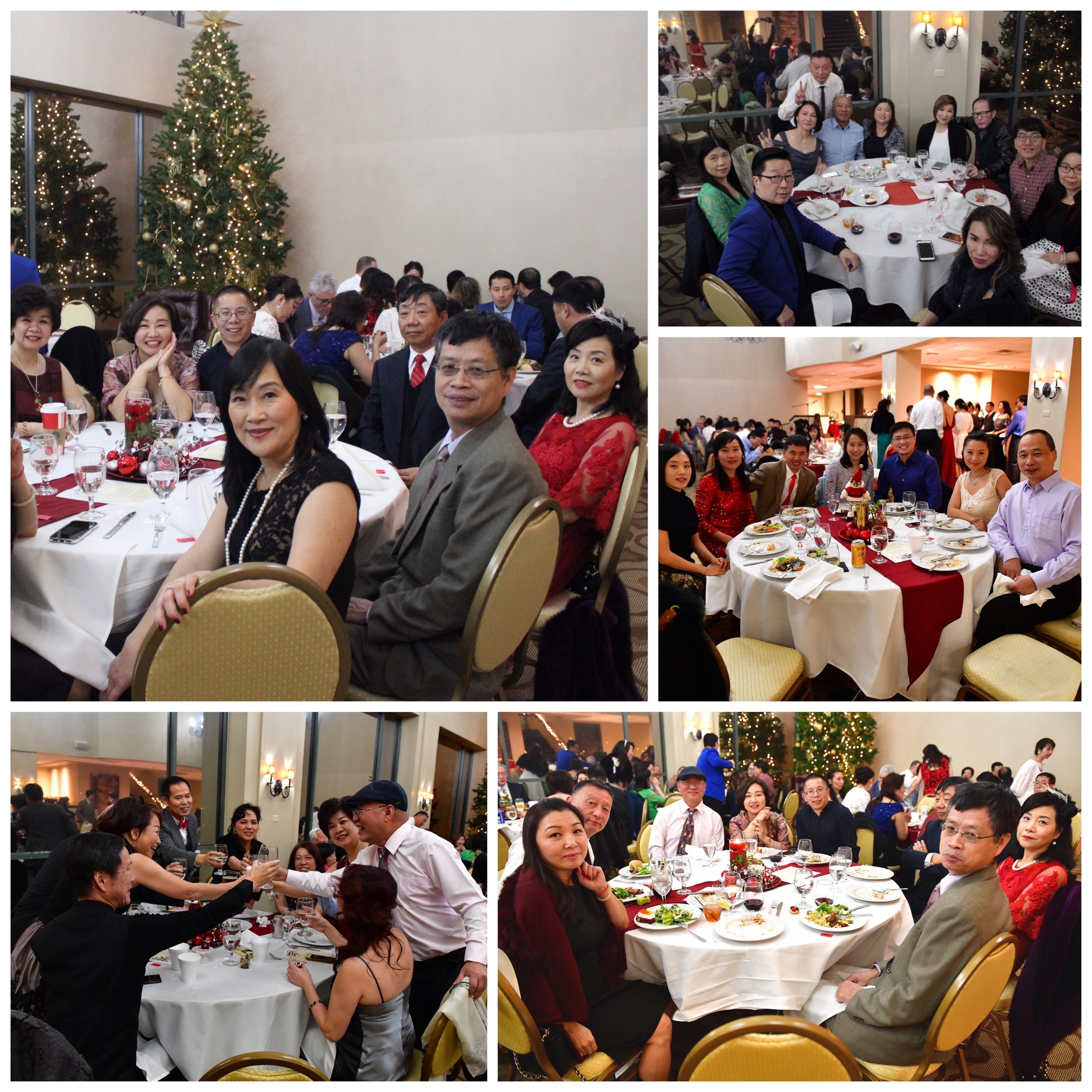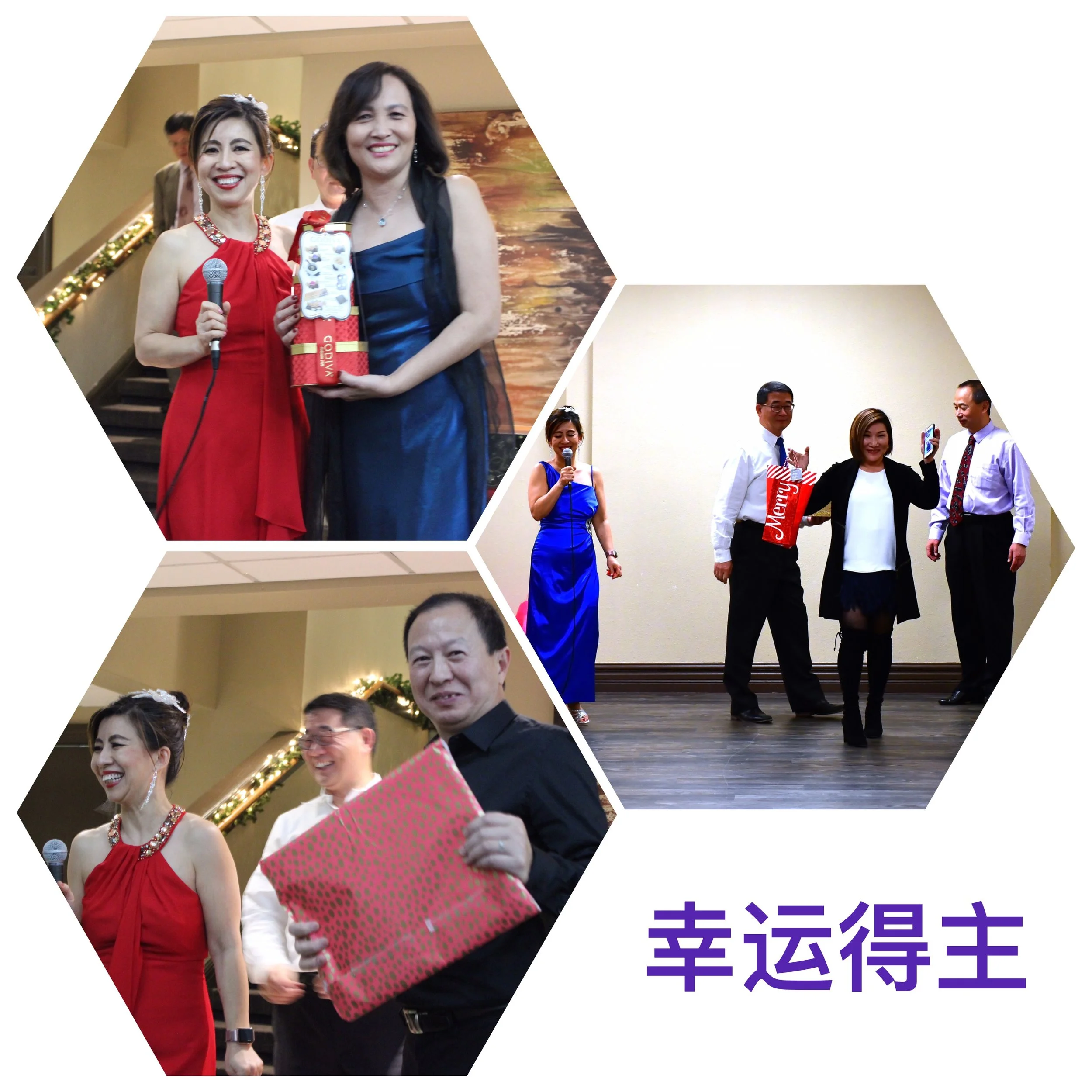 晚宴的菜单包括牛排,三文鱼,蔬菜,和诱人的甜品。朋友们拉家常,品红酒,尝美食,回味2018,展望新的一年。海阔天空,说不完的话,道不尽的感慨。席间群主陈艳女士轮流向各桌朋友敬酒,预祝大家新年快乐。主持人许瑾女士请客人们拿出签到时领取的彩票,开始第一轮礼品抽奖。王涌波(Debbie)与其他几位会员从各界朋友及商家那里共筹集到价值超过千元的抽奖礼品和价值三千多元的竞拍礼品。当大家了解到竞拍收入将全部捐赠给华盟以支持明年2月16日的文化节筹备,用过餐的客人们把长长的礼品竞标台围了个水泻不通,争相在中意的竞标单上写上自己的名字。这次晚会的礼品拍卖为华盟筹集了二千多美元的善款,为宏扬中华文化贡献一份力量。