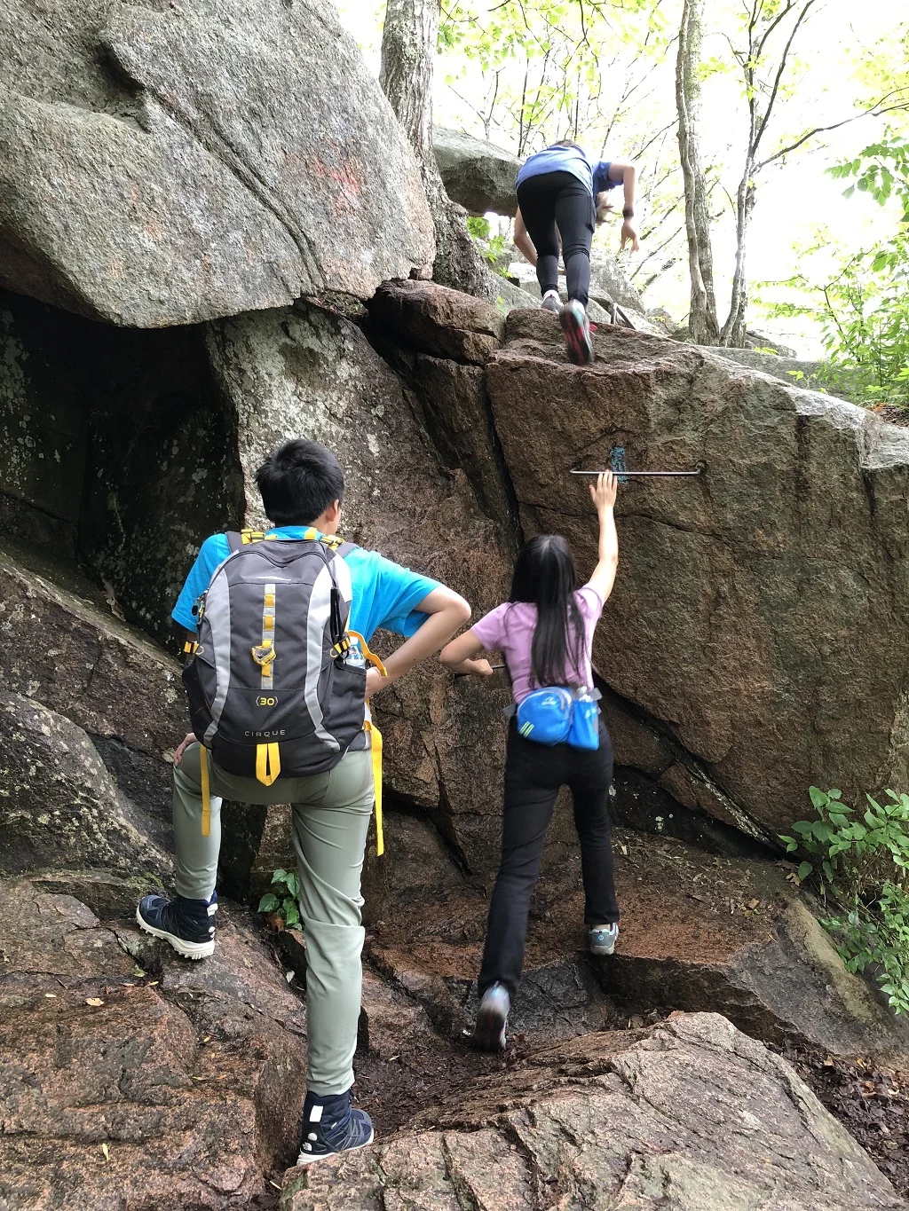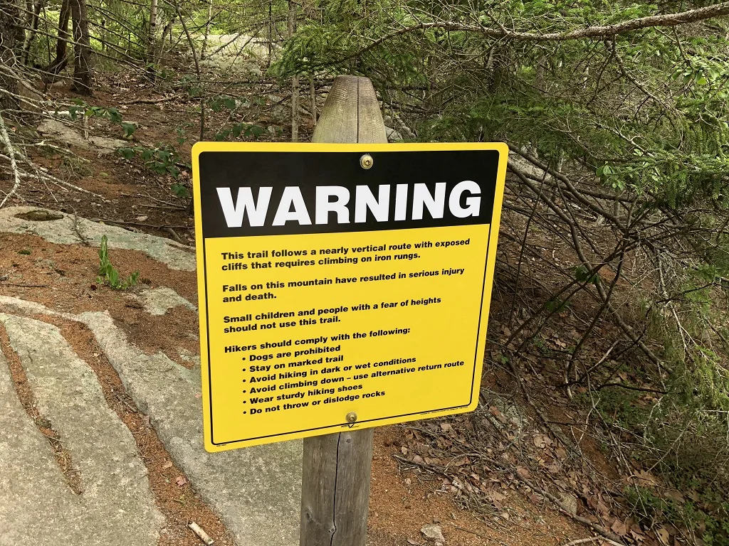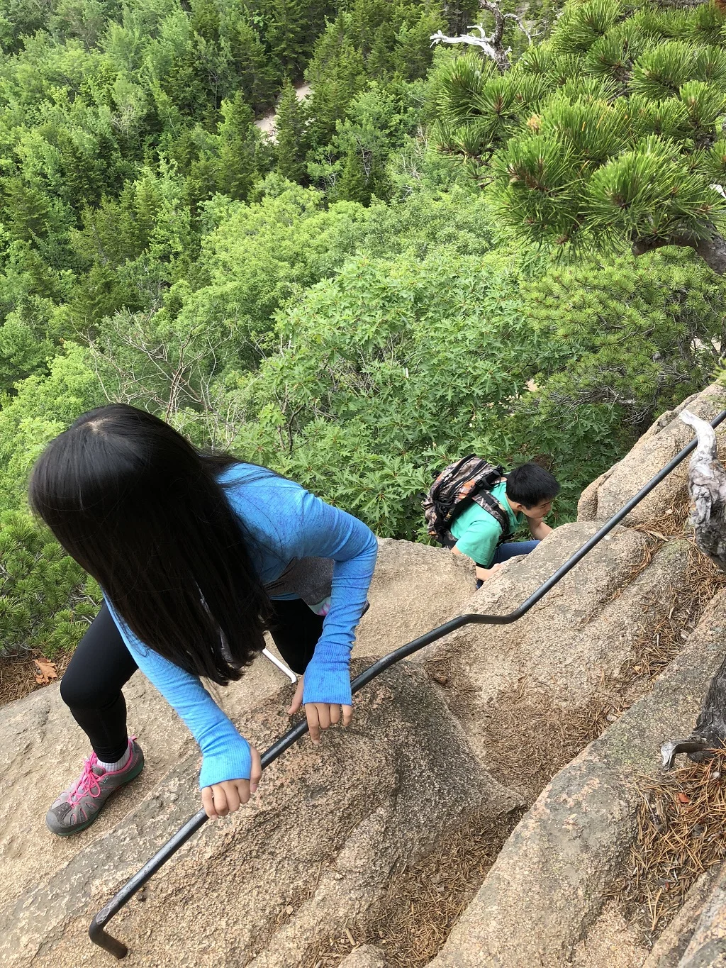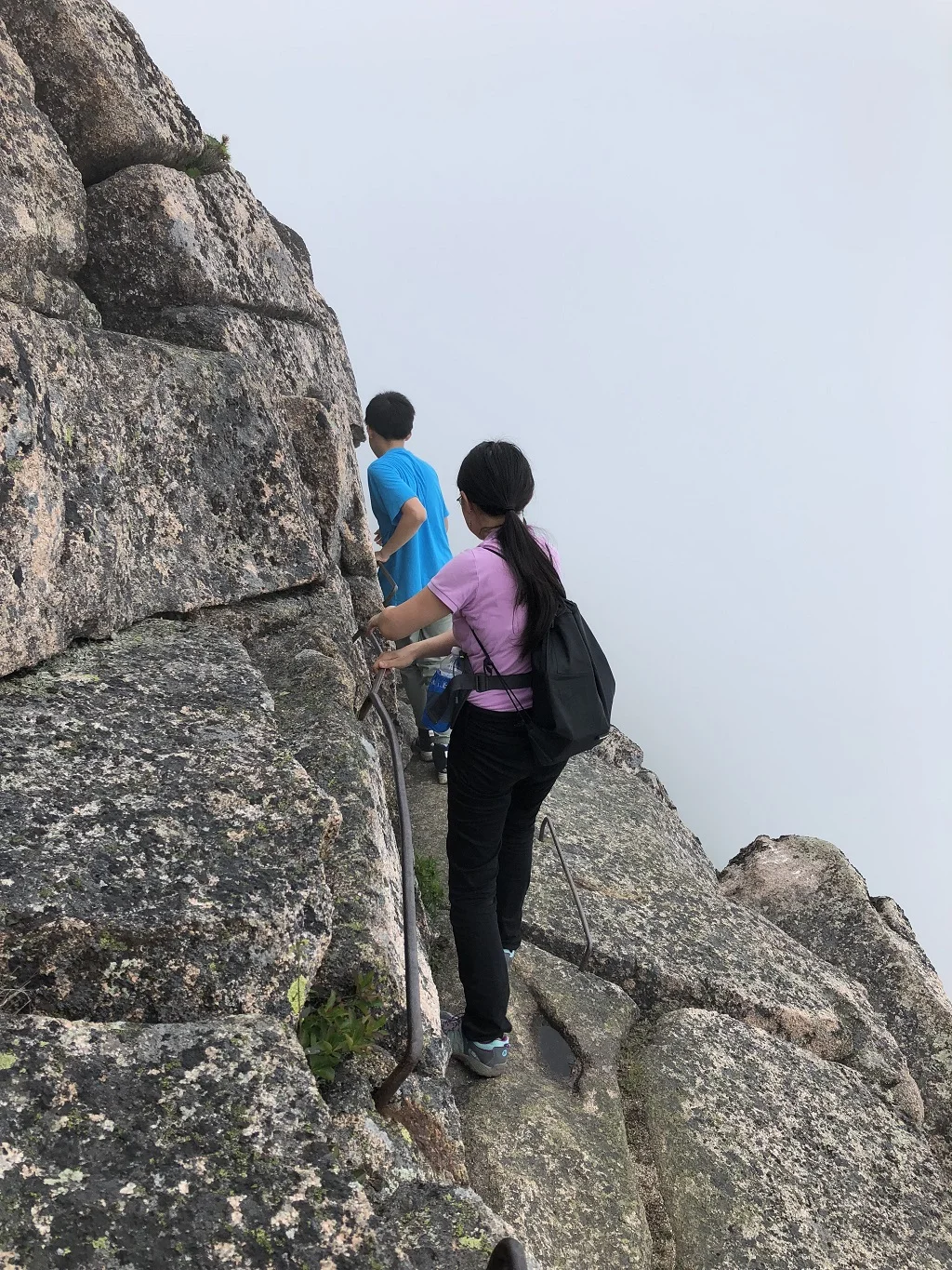 路口有个警示牌: “Think twice before climbing up the trail –the steepest and most challenging hiking trail in Arcadia.”我怀疑跟在我们后面的那家人没有读这个牌子。一路上就听见他们家的那个17,8岁的小伙子贴着石璧”Oh, My God…My God!”地叫,“Mommy you owe us a big lunch for bringing us here!”他们家的另一个小男孩吓得一直哭,但是他们没有退路只能硬着头皮上,因为这条步道不准逆行。步道的确很危险,大部分地段要手脚并用,有的悬崖是近乎垂直的石壁,要沿着铁梯才能爬上去,对有恐高症的人来说绝对是一场残忍的折磨…况且石缝里还可能有蛇埋伏..