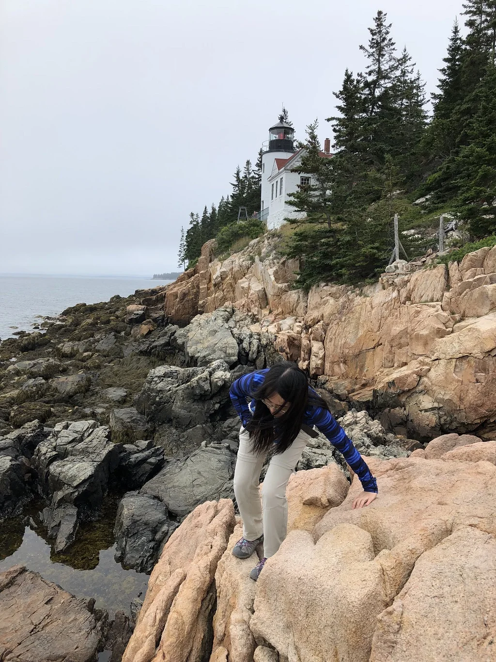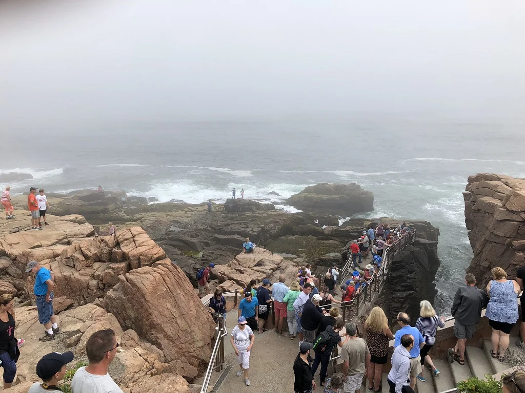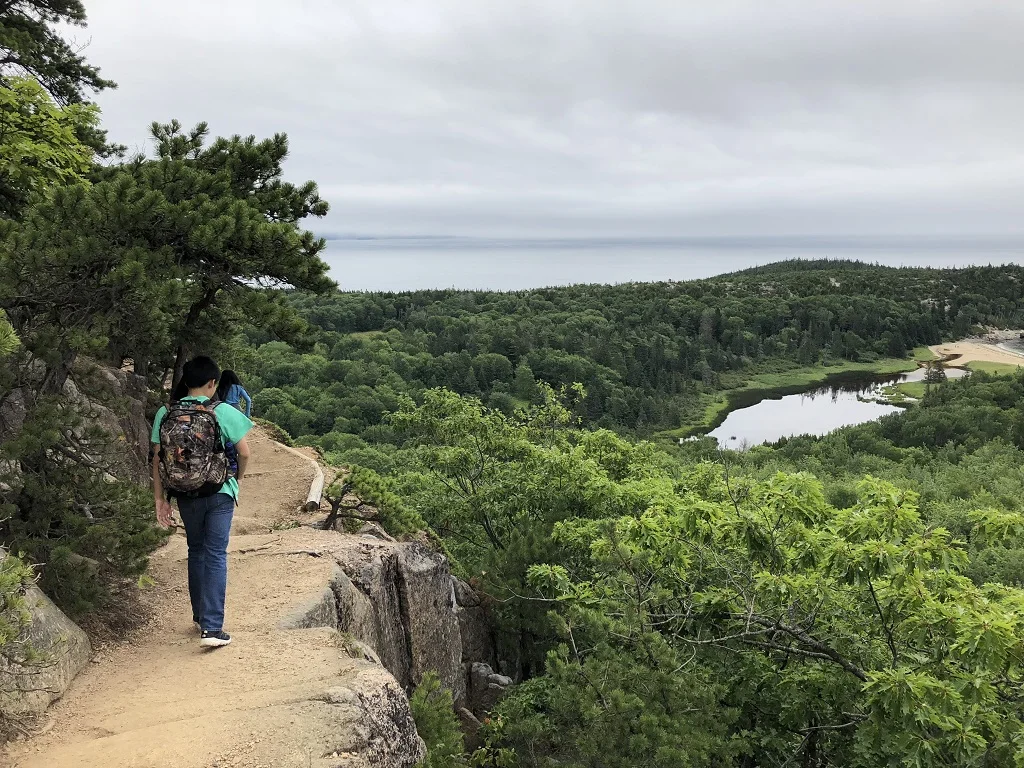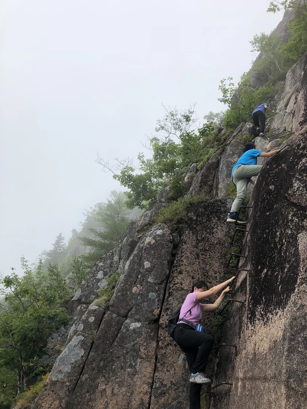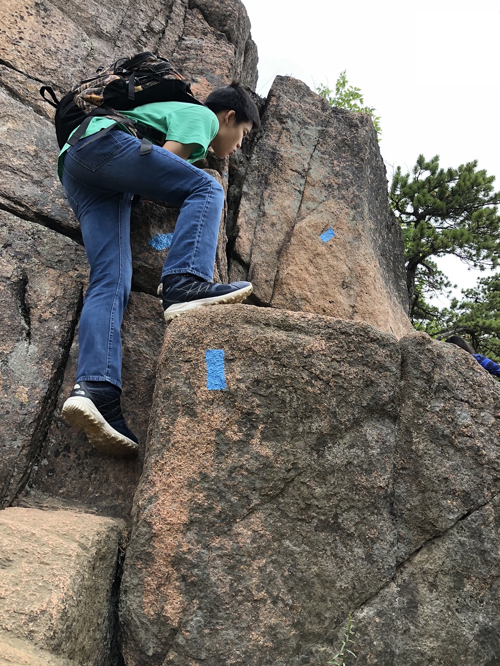 路口有个警示牌: “Think twice before climbing up the trail –the steepest and most challenging hiking trail in Arcadia.”我怀疑跟在我们后面的那家人没有读这个牌子。一路上就听见他们家的那个17,8岁的小伙子贴着石璧”Oh, My God…My God!”地叫,“Mommy you owe us a big lunch for bringing us here!”他们家的另一个小男孩吓得一直哭,但是他们没有退路只能硬着头皮上,因为这条步道不准逆行。步道的确很危险,大部分地段要手脚并用,有的悬崖是近乎垂直的石壁,要沿着铁梯才能爬上去,对有恐高症的人来说绝对是一场残忍的折磨…况且石缝里还可能有蛇埋伏..