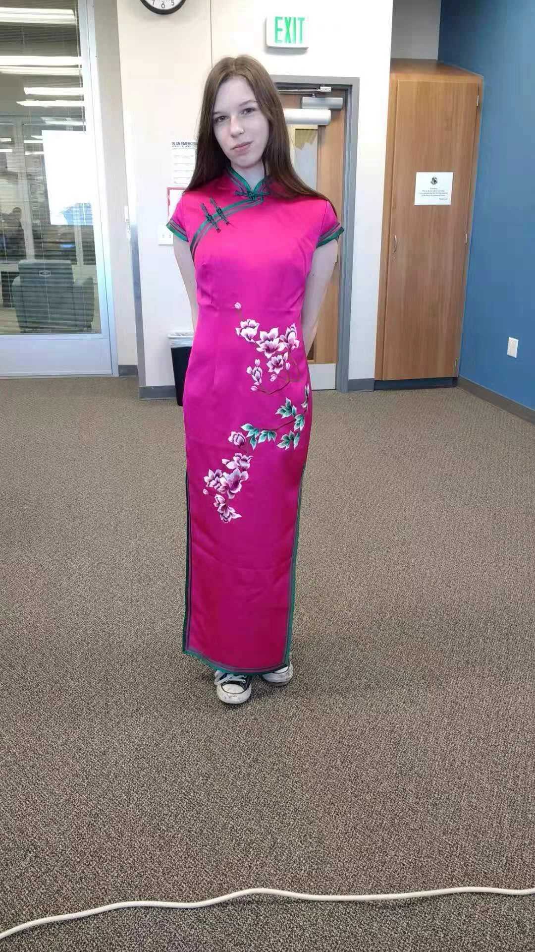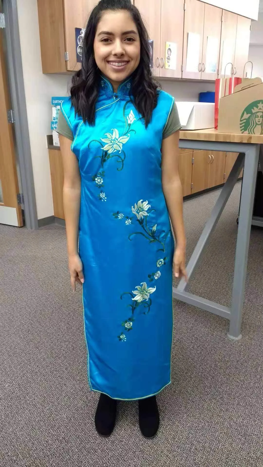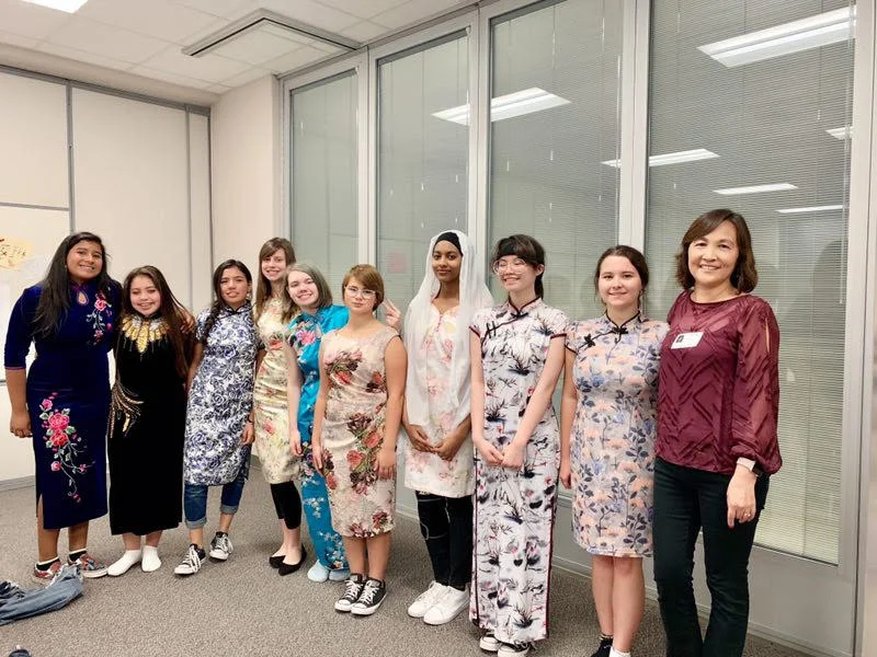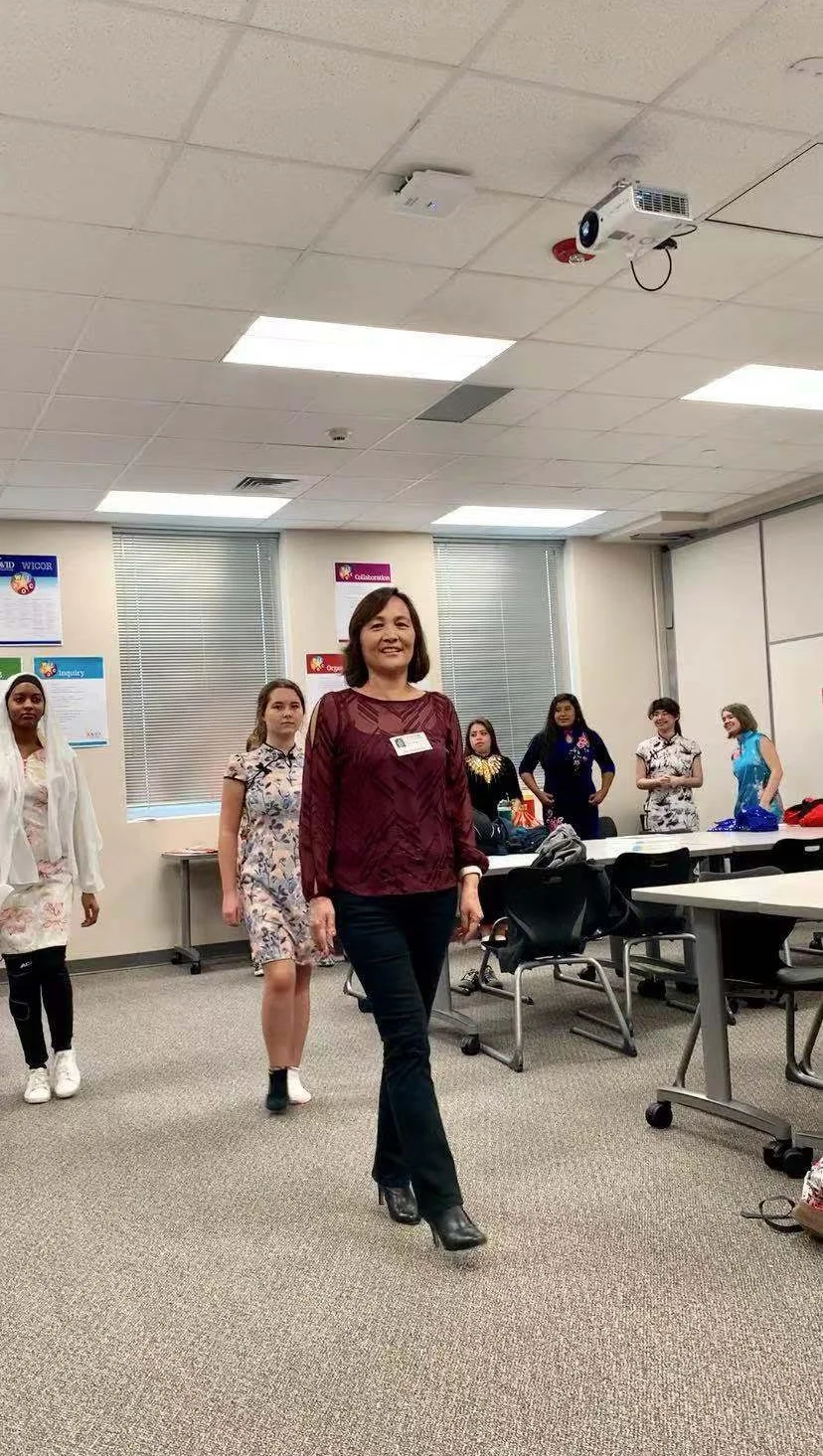 时至今日,旗袍的魅力还让它稳霸时尚界中式风格的头把交椅。奥斯汀华盟(ACAN)为了弘扬中国文化,前不久在大Austin区域的中学里开展了一次宣传活动,有40多名来自Glenn High School and Cedar Park High School的学生 参加了这次活动。每组学生每次有一个小时的时间体验,这也是她们平生第一次有机会试穿旗袍,极大地满足了学生们的好奇心。大家在饶有兴致地试穿的同时,惊叹每件衣服的质地、色泽和款式,并由志愿者们指导,在甬道上体验走红毯的感觉。为时一个小时的体验,欢声笑语不断,真是一个别开生面的经历!