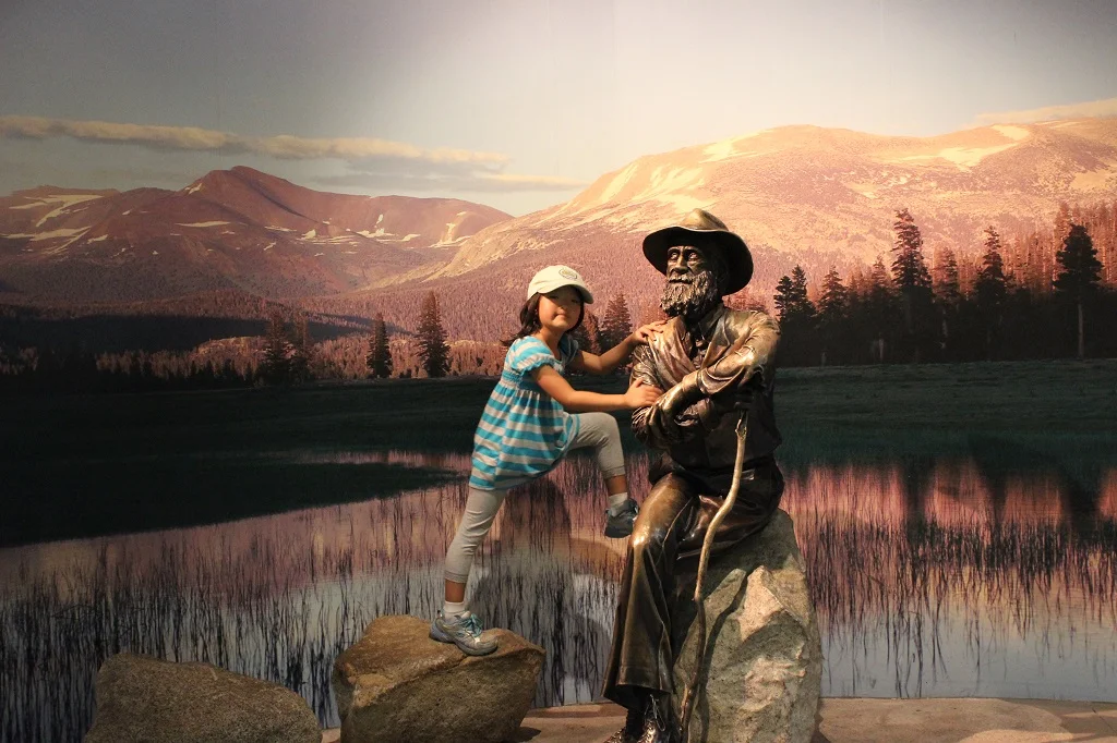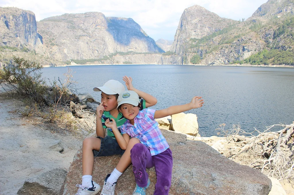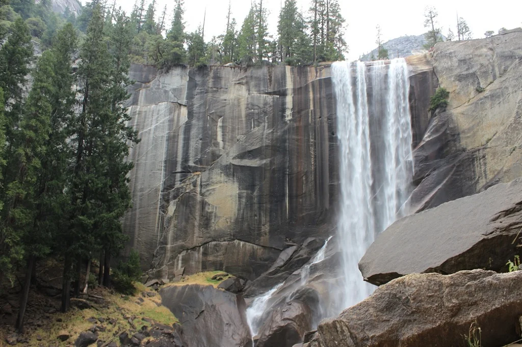 优胜美地有很多瀑布,我们来的不是时候,好多瀑布水都干了。听说还剩两个水比较大的,一个是Vernal falls, 另一个叫Navada falls,而且两者离得很近,下午的时候决定一路直上看瀑布去。徒步上山一个来回有三英里(十华里的样子),很多地段是崎岖的山路。小路的一边是陡峭的悬崖,往谷底探头可以隐约看到奔腾的溪水。过了一个木桥,雄伟的Vernail瀑布就亮然挂在不远处的山壁上。我的脑子里立马闪过李白的经典诗句:“日照香炉升紫烟,遥看瀑布挂前川"。我们沿着陡峭的石阶上到了瀑布的近前,冰凉的水汽迎面扑来,立刻有降温解暑之功效。